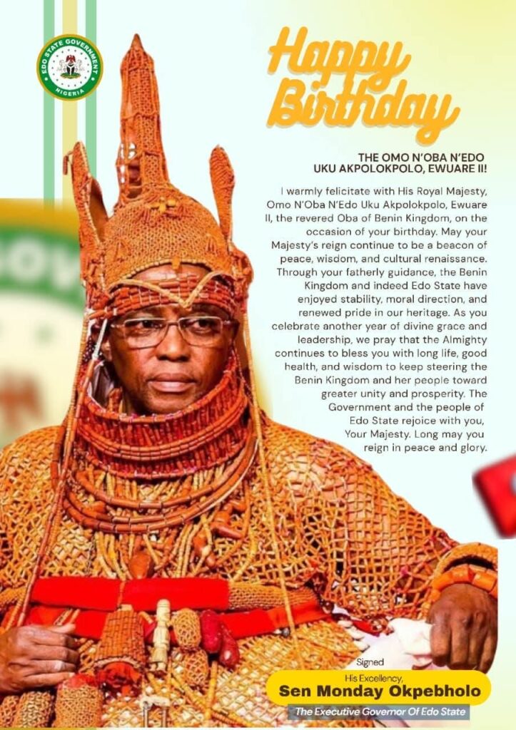 The Executive Governor of Edo State, His Excellency Senator Monday Okpebholo, has joined millions of well-wishers in celebrating the revered Oba of Benin, His Royal Majesty, Omo N’Oba N’Edo Uku Akpolokpolo, Ewuare II, on the occasion of his birthday and ninth coronation anniversary. In a statement issued by the Chief Press Secretary to the […]