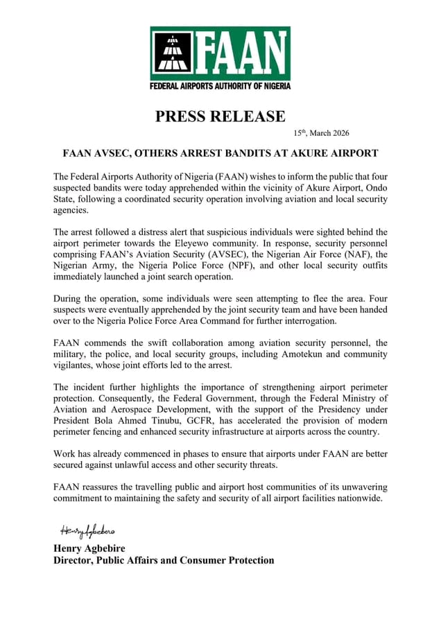 The arrest was confirmed in a statement issued late Sunday by the Federal Airports Authority of Nigeria, which disclosed that the suspects were apprehended around the vicinity of Akure Airport after security personnel responded to a distress alert about suspicious movements near the airport fence.