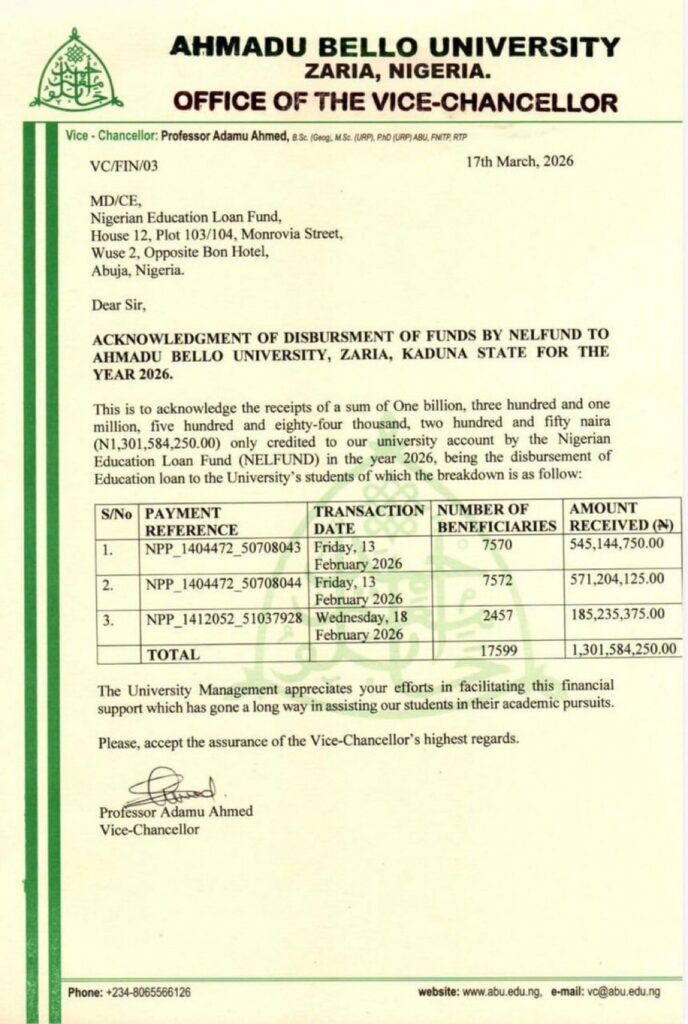 The disbursement was acknowledged in an official letter dated March 17, 2026 and signed by ABU Vice-Chancellor Professor Adamu Ahmed, addressed to the Managing Director and Chief Executive of NELFUND at its Wuse 2 office in Abuja.