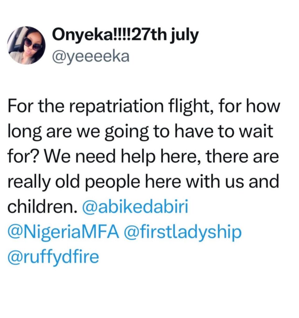 According to her, citizens of other countries who were also in transit had already been evacuated or assisted by their governments, leaving Nigerians as the majority of those still waiting for help. She added that several attempts had been made to contact the Nigerian embassy and consulate but no positive response had been received.