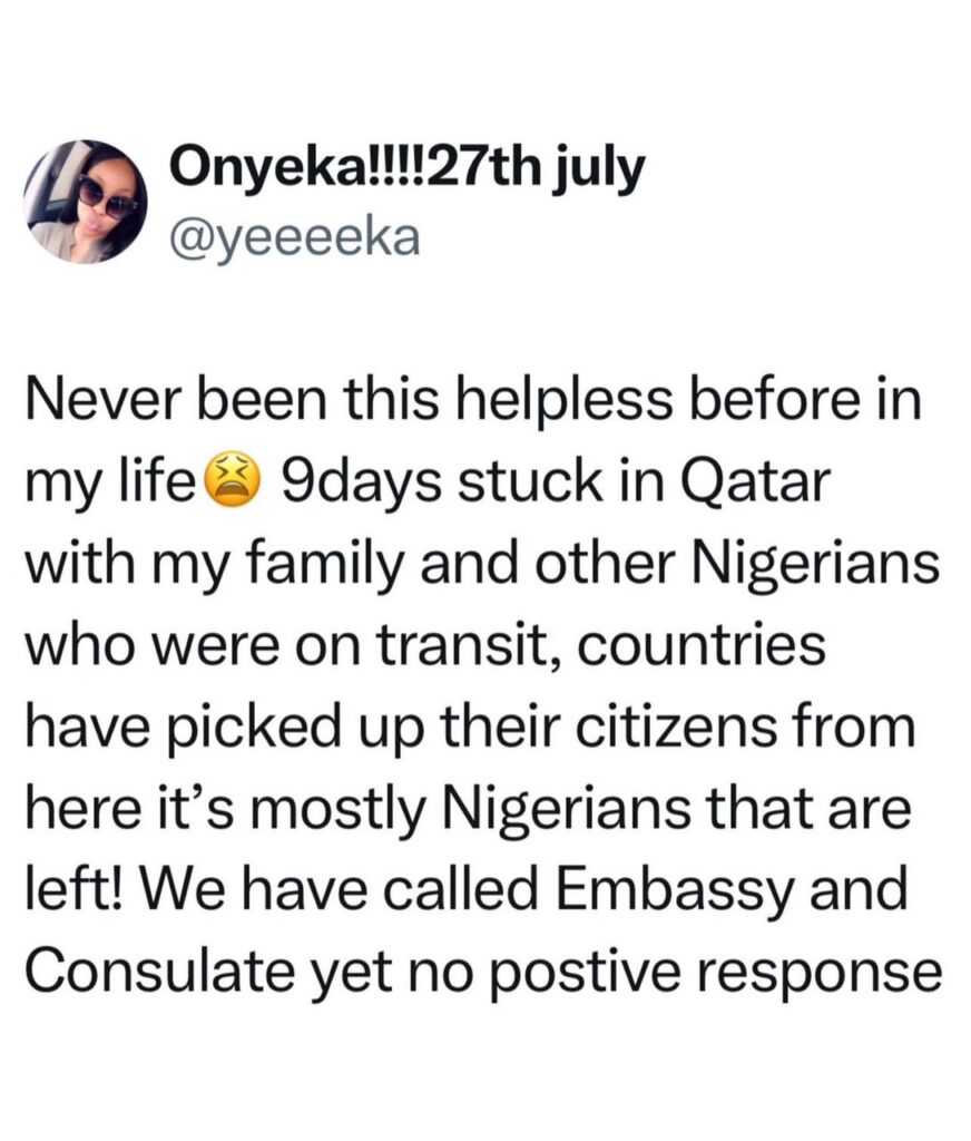 A Nigerian traveller has raised concerns over the plight of Nigerians reportedly stranded in Qatar, claiming that many have remained stuck for days without assistance from Nigerian authorities.