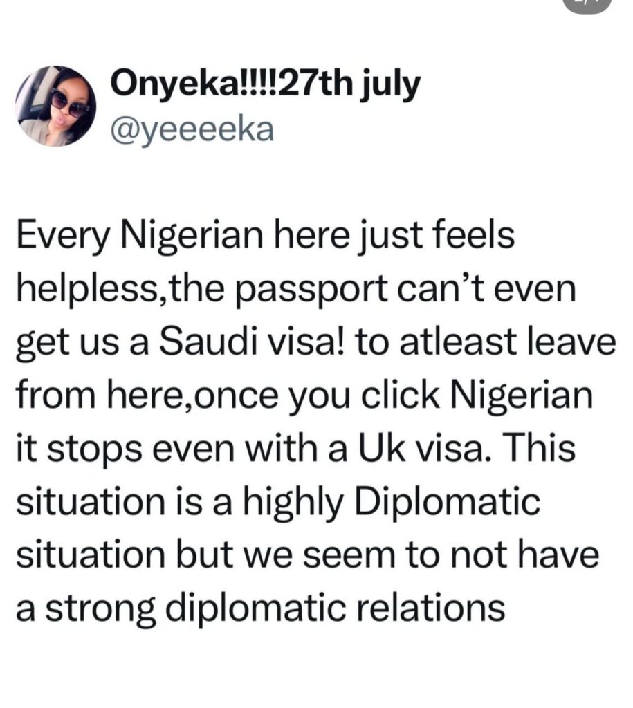 The traveller, identified on social media as Onyeka (@yeeeeka), said she and other Nigerians have been stranded for nine days while transiting through the Gulf country.