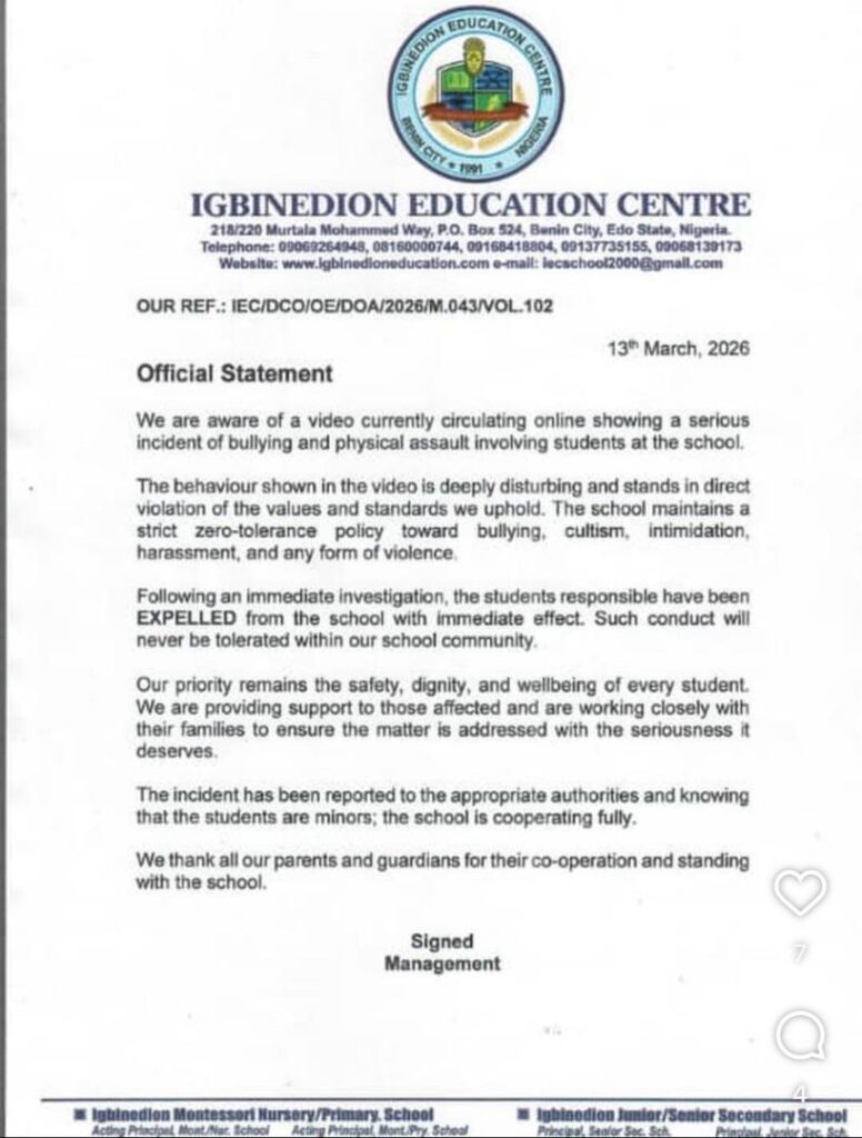 Igbinedion School Expels Students, Police Invite Parents Over Viral Bullying Incident March 14, 2026 No Comments