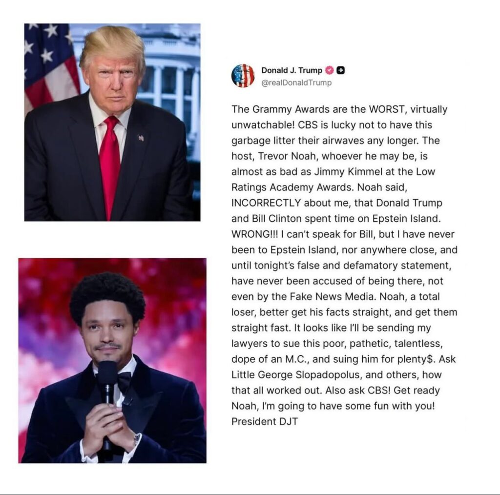 In a statement shared on his social media platform, Trump accused the Grammys’ broadcaster, CBS, of airing what he called “garbage” and faulted Noah’s performance as host.