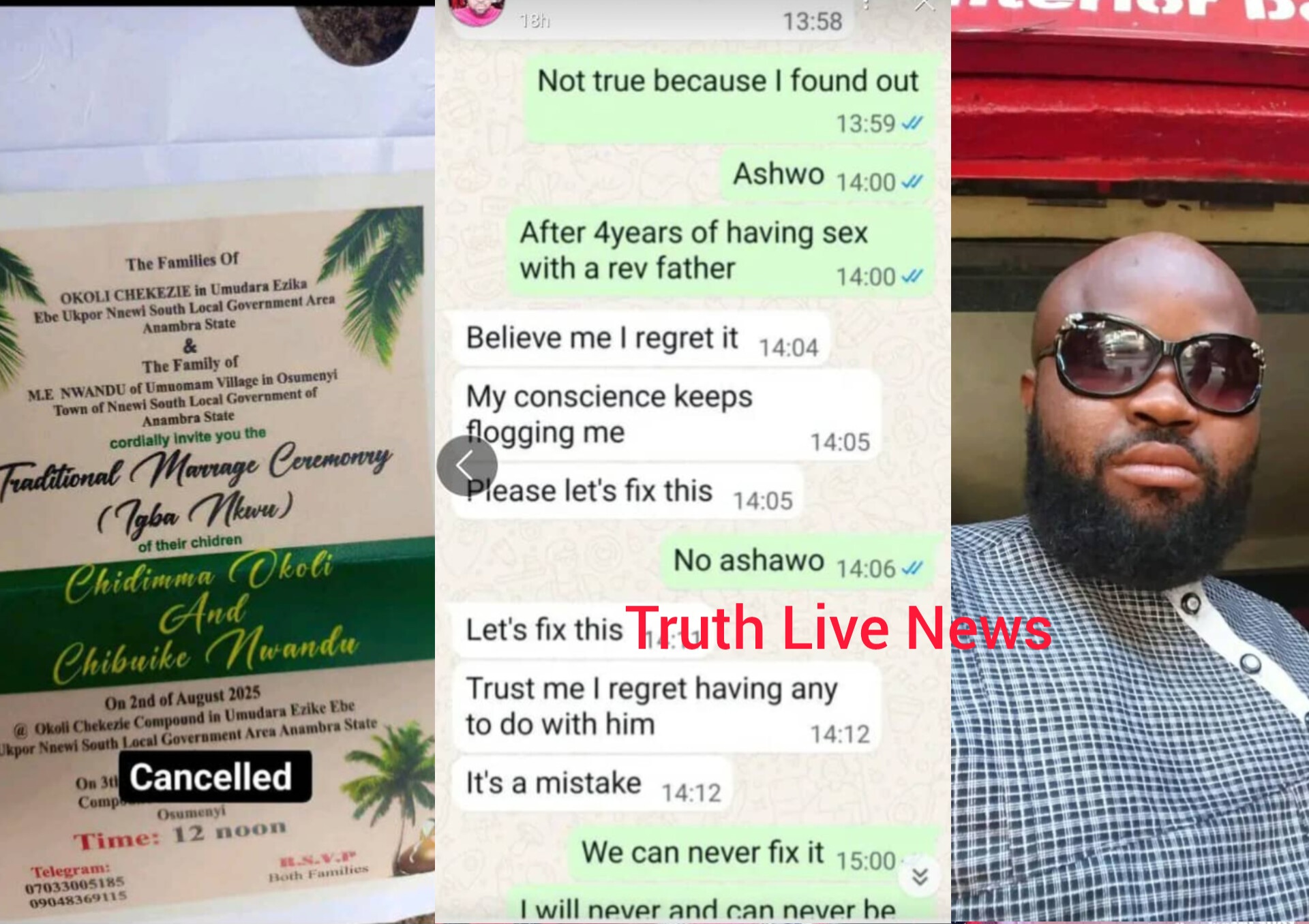 “It should have taken place on the 2nd of August 2025, but it is now cancelled,” Chibuike wrote. “I discovered she was still in an active sexual relationship with her Rev. Father, even after our introduction. I have her confession on tape.”