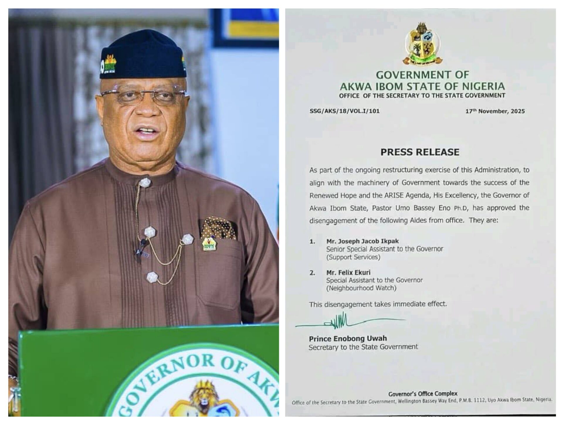 Their disengagement was contained in a statement issued by the Secretary to the State Government (SSG), Prince Enobong Uwah, who described the action as part of the governor’s ongoing efforts to realign the machinery of government with the Renewed Hope and ARISE Agenda.