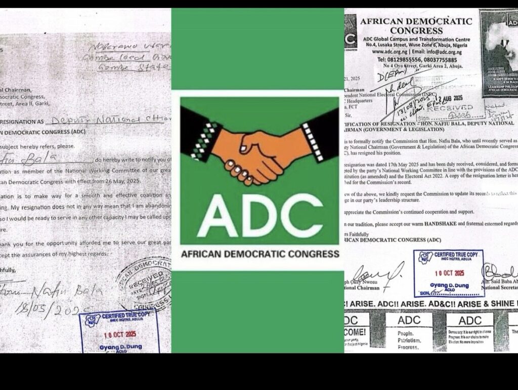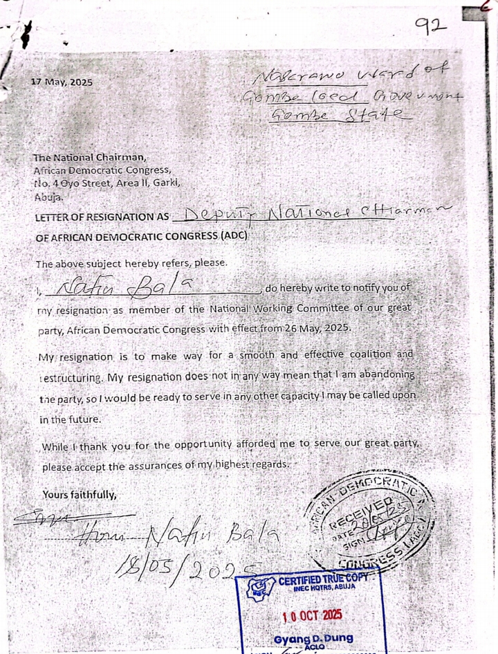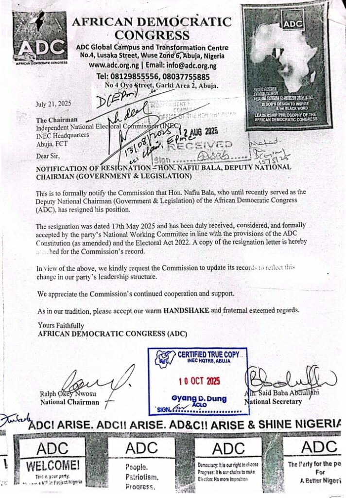 Further reinforcing this position, the party formally notified the Independent National Electoral Commission, INEC, in an official communication dated 21 July 2025, confirming that the resignation had been duly received and accepted by the National Working Committee in line with the ADC constitution and the Electoral Act .