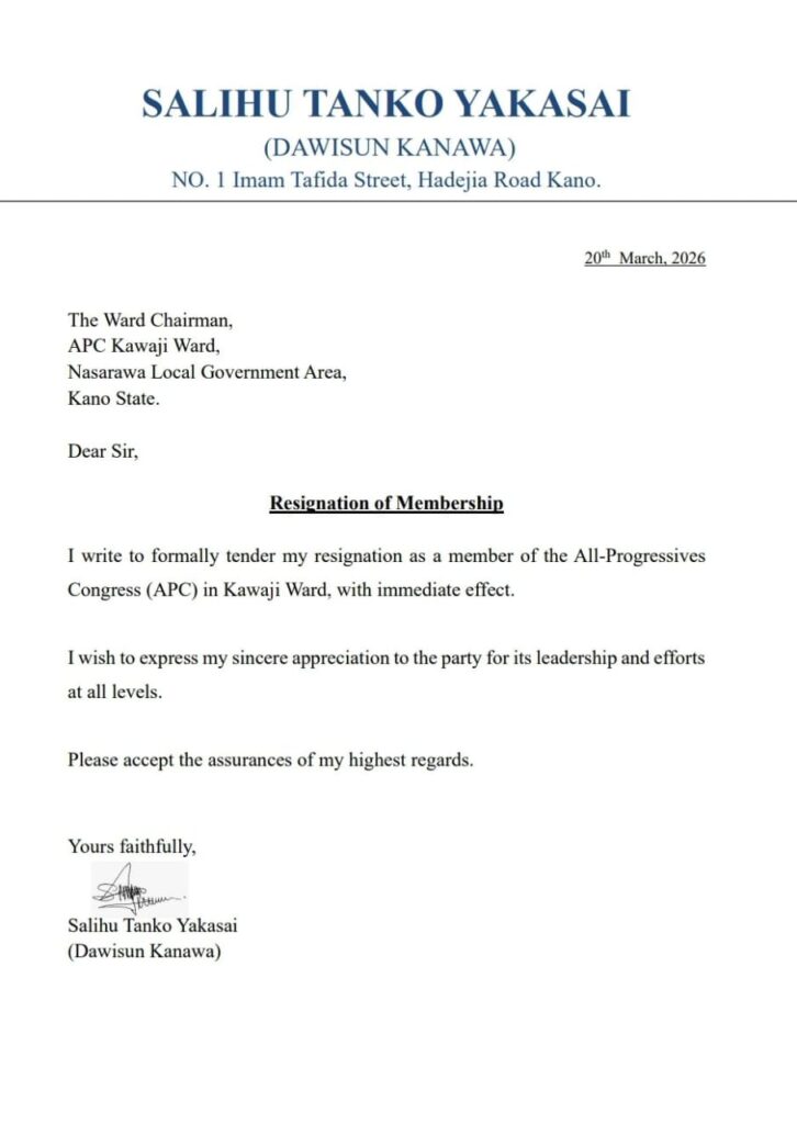 Prominent Kano political figure Salihu Tanko Yakasai has officially resigned from the All Progressives Congress (APC) and joined the African Democratic Congress (ADC).