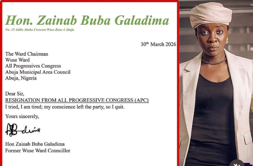 The letter, dated March 30, 2026, and addressed to party officials in Wuse Ward, Abuja, announces her resignation from the All Progressives Congress (APC). What has drawn particular attention, however, is its strikingly brief and blunt message: “I tried, I am tired; my conscience left the party, so I quit.”