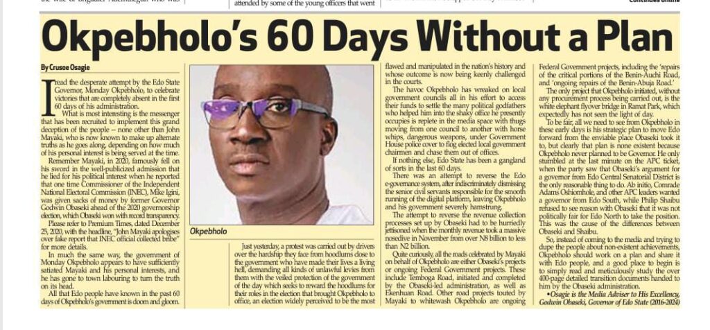 Okpebholo’s 60 Days Without a Plan — By Crusoe Osagie